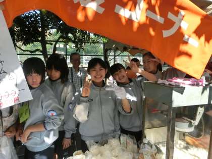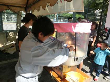 綿菓子やポップコーン作りを手伝っています。東北支援コーナーでは、福島産の野菜を売る手伝いをしています。完売目指してがんばれ!(遠藤)