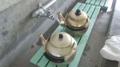 朝食が終わりました。みんなおかわりしています。一色先生もおかわりです。お茶を水筒に入れて出発します。霧のため、富士山は残念ながらまだ見えません。