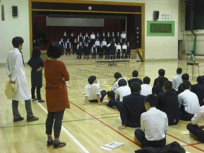 今日の縦割り練習はD組でした。朝からみんなで舞台に立って練習します。どの学年のD組も一生懸命です。そうした発表する姿から得るものは多いですね。舞台上から気持ちよい声がだせましたね。(副校長)