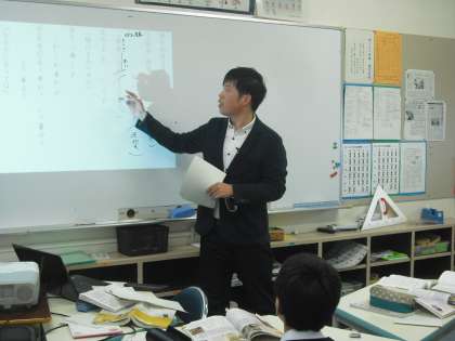 きこえの学級の国語です。今日は平家物語の一の谷の戦いの熊谷直実と平敦盛の場面について学習しました。教科書の文章や画像、先生の解説で読み進めていきます。波打ち際で一騎打ちの様子がイメージできましたか。(副校長)