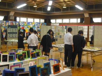 各学年でも、時間をきめて作品展を見学します。授業中は自分の作品に集中していたと思いますが、さまざまな作品を見て、これはすごいなと感じることが大切ですね。じっくり鑑賞してください。(副校長)