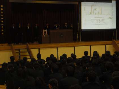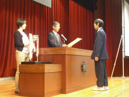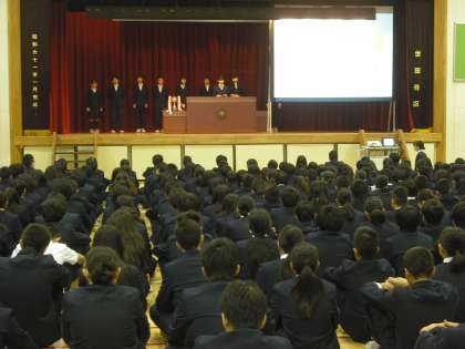 生徒会朝礼では、生徒会本部委員と専門委員会からのお話しです。生徒会からは防災塾やTボール大会、生徒会サミットについて、また保健委員さんからノロウイルス、インフルエンザなどの感染症のことについて説明がありました。さらに11月4日に行われたスピーチコンテストでレシテーション部門1位の表彰がありました。生徒のみなさなの活躍が光っています。(副校長)