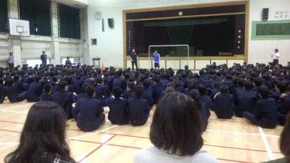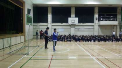 ブラインドサッカー日本代表の選手と協会の方より、実演と講演をいただきました。質問コーナーでは、たくさんの生徒たちが意欲的に質問して、聞いている様子もたいへんよかったですね。生徒会長のお礼もすばらしかったです。テレビなどではなく「本物」と直接触れ合うのは、やっぱり説得力がちがいます。あきらめない強い気持ち、個性としてとらえる障害、人にやさしく接することなど、たくさんのことを学びました。