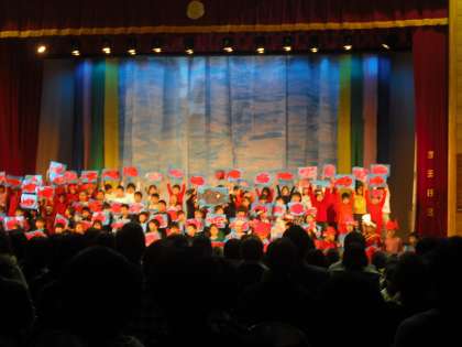 駒沢小学校の学芸会では、2年生が「スイミー」を演じています。学年みんなが協力して1つの大きな魚を演じていました。学年のまとまりを感じますね。(副校長)