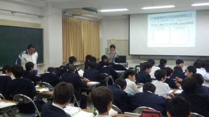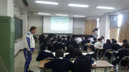 1年生の男子の保健です。養護教諭の菅野先生と保健体育の柴田先生の「コラボ授業」です。スライドを使いながら、生徒の思考を促す指導はさすがだなと思いました。より専門的な視点による分かりやすい授業でした。