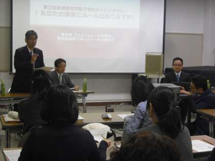 11月26日に第3回家庭教育学級が約30名の参加者で行われました。今回は子どものネットリテラシーについて東京ファミリeルールの方にお越しいただきました。ネット社会という大きな街でどのように過ごしていくのか、そのためのコミュニケーションなどのスキル、そして家庭の中でのルールづくりなどのお話しをいただきました。保護者のみなさまご参加いただきありがとうございました。(副校長)