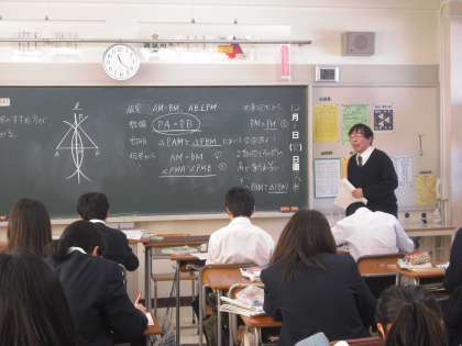 今日も佐藤先生の証明についての授業です。毎時間プリントを用意してくださり、みんなも集中して取り組んでいます。今日は1年生で垂直二等分線の作図から、その線は、どんな点の集まりなのかを証明しました。1年生で学習したことも2年生ででできます。振り返りも大切ですね。(副校長)