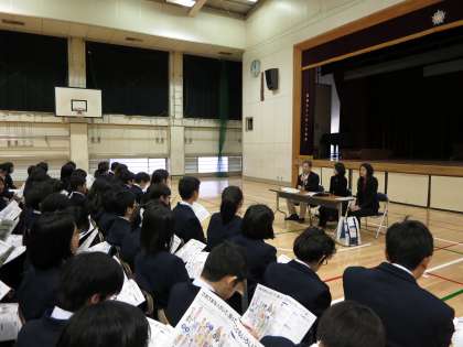 本日、公益財団法人の方をお招きして、1年生はバリアフリーやユニバーサルデザインについて学習しました。