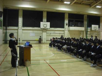 障害者週間の12月7日、3年生は4時間目に体育館で講演会を行いました。お話しの中で講師の方から「障害者も夢ややりがいを持って働きたい。」という言葉をいただきまた。3年生にとっても大切にしたいことだと思います。(副校長)