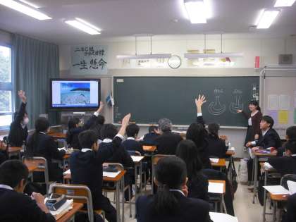 松本先生の理科の授業では、2年生は授業中、挙手して発言するというルールが定着しています。話合い活動の基盤としてとしても大切ですね。そうしたことがしっかりできている2年生の様子です。(副校長)
