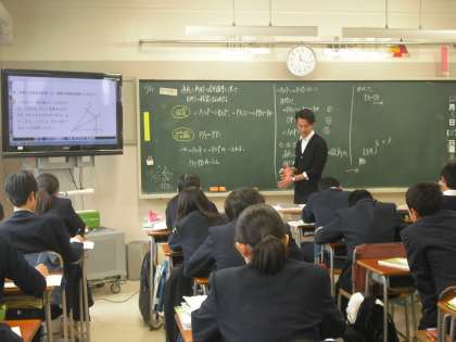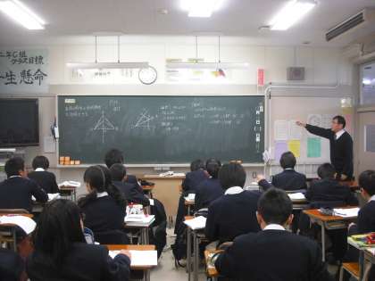 2年生の数学の授業では、直角二等辺三角形の合同の証明の授業でした。角の中に円がすっぽりと入ることが証明されたり、角の二等分線がどんな点の集まりかを考えることができたり・・・。けっこう興味深い内容でした。(副校長)