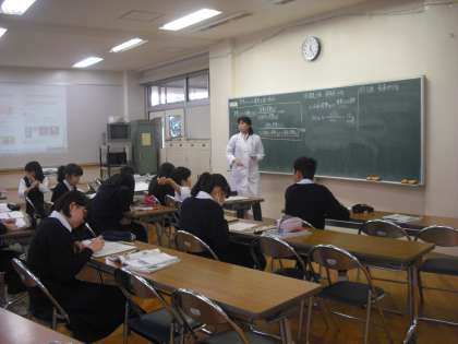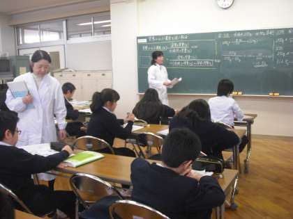 1年生の理科の授業は、食塩水の濃度の問題です。濃度と量とその中の塩の量の3つの要素が計算式のどこに入るのかを考えていくのですが、相手が見えないものだけにみんな頭をひねりました、でもがんばりました!(副校長)