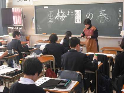 2年生が国語で書写の授業です。なかなか筆を持つ機会が少なくなってきています。筆の感触や墨の含ませ方、紙へのにじみ具合・・・。体験してみるとわかる大切なものなのですね。(副校長)