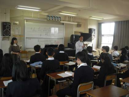 3年生はアルトリコーダーの練習です。小林先生と立川先生の指導でみんなで合奏しています。3年生はみんながおちついて授業を受けています。一人で演奏する人にも、みんなで包み込むような雰囲気でとてもよいですね。(副校長)