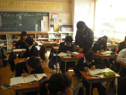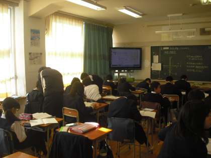 数学の授業で作図の学習です。田村先生がていねいに手順を確認しています。手順ともに、それがどのように役に立ち、完成した図はどうなるのかをイメージしておくことが必要ですね。みんな「え〜、どうすればいいの?」と考えています。(副校長)