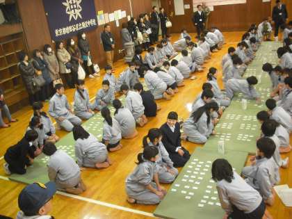 1年生は百人一首大会です。1年生がみんなで一堂に会して行いました。先生方が、一首ずつ読んでいきます。畳ごとにみんなの手が動きます。札をとると歓声があがります。こうした人数で行う機会は貴重です、みんなでないとできない伝統行事を堪能しましたね。保護者のみなさまご参観ありがとうございました。(副校長)