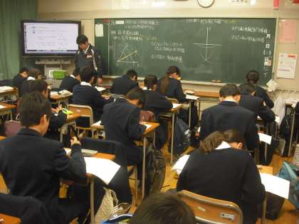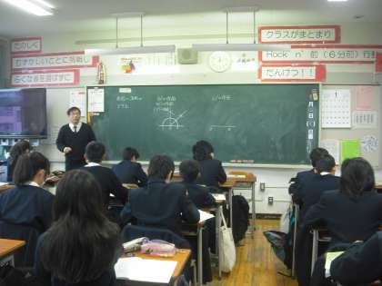 数学は作図の授業です。2学期からの引き続きです。間に冬休みをはさんでいますが、方法など覚えていますか。それにしても分度器を使わずに30度や135度が描けるなんて不思議ですね。(副校長)