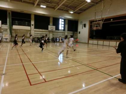 午後の体育館では、バスケットボール部が緑ヶ丘中と練習試合を行っています。
