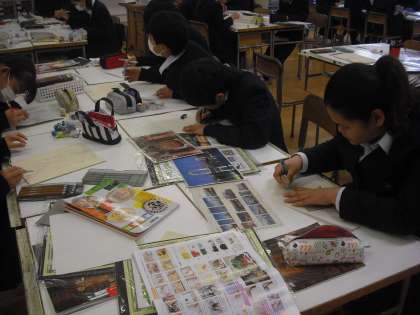 1年生の版画の授業です。版木に描きこんでいく絵は、1年生が校外学習で訪れた東京の名所です。楽しかった都内巡りの思い出がよみがえりますね。思い出とともに気を付けて作業して作品を仕上げてください。(副校長)