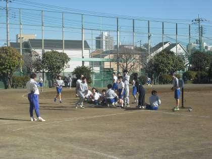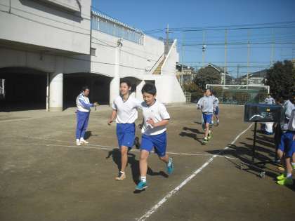 保健体育の授業は、校庭です。10分間走に2年生が取り組んでいます。午後の校庭は日差しがたっぷり、身体をうごかすにはよい環境です。ベストをつくして、今回は15周くらい走ったかな。「あと1分、がんばって」の声にスパートがかかります。(副校長)
