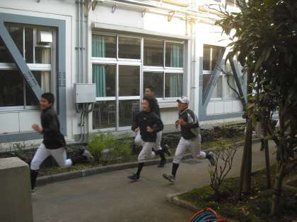 部活動の朝練習です。いつも朝から取り組んでいます。今日は体育館では女子バスケットボール部が週末の公式戦にむけて気持ちを引き締めています。校庭では野球部です、基礎体力をつけるべく、毎日ダッシュを欠かしません。(副校長)