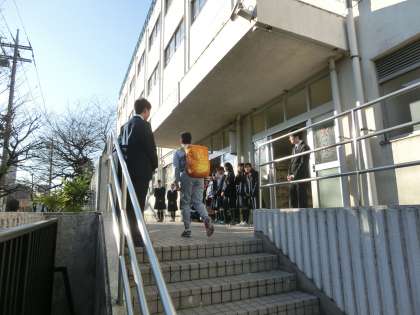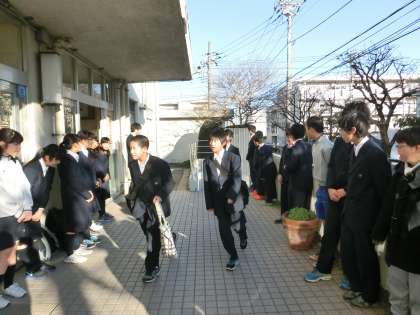 生徒会本部役員とJRC部の生徒が、登校してくる生徒を元気なあいさつで迎えていました。(遠藤)