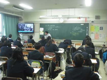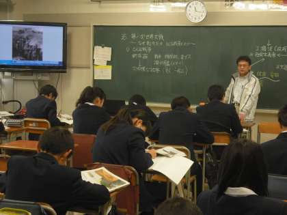 2年生の社会の時間は、川原先生がICTを活用して、第一次世界大戦について説明しています。 実物や写真などを授業に取り入れて説明してくださるので、みんなも第一次世界大戦の様子が実感できます。(副校長)