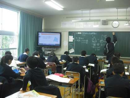 田村先生の1年生の数学の授業です。「見取り図をかきなさい。」「作図をしなさい。」と教科書の問題で授業のまとめをしています。それぞれの名称、また作図の方法やどうしてそうなるのかなど、たくさんの知識を用いてみんな問題に挑戦しています。(副校長)