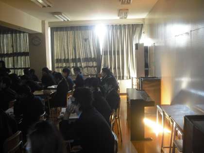 2年生の音楽はクラシックの鑑賞です。画面から流れるオーケストラの演奏、落ち着いて鑑賞しています。指揮者の様子など、合唱コンクールなどでも取り入れられるかな?1時間目は音楽室は朝日が差し込みます。落ち着いた暖かい雰囲気が醸されます。(副校長)