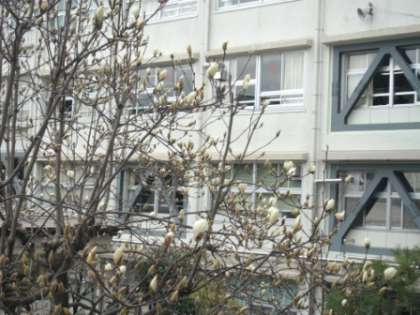ここのところの寒さの緩みからか、中庭のハクモクレンがすっかり咲きました。また今年植えた梅も可愛らしく咲いています。今年は例年より開花が早かったようです。このまま穏やかな春がやってきますように。(副校長)