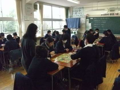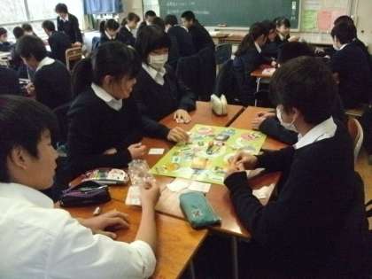 2年生の家庭科の授業では、消費者トラブルの解決策についての学習でした。内容の学習をした後に、すごろく型の対策ゲームに班ごとに和気あいあいに取り組んでいます。みんなは、ゲームを通して何かあったときの相談窓口についてしっかりわかったようです。(副校長)