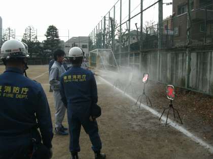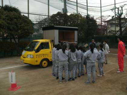 校庭では地震体験の起震車と、初期消火訓練がありました。東京消防庁の方、世田谷区地域振興課の方、上馬まちづくりセンターの方のおかげで、さまざまな体験が準備されています。クラスごとにまわって体験していきます。(副校長)