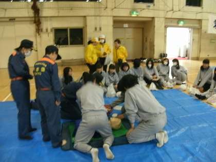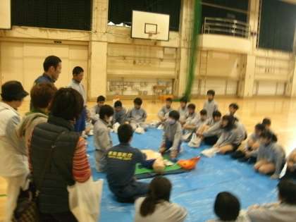 体育館では、応急救護訓練です。消防署、世田谷消防団第13分団のみなさんのご協力で行っています。AEDの使用など、さまざまな場面で必要になる大切なものです。みんな真剣に訓練に参加しています。(副校長)