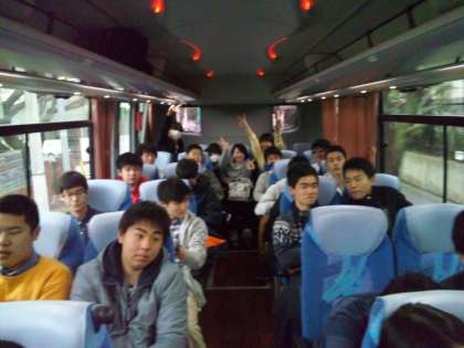 外は雨ですが、D組のバスの中は、みんな元気です。(遠藤)