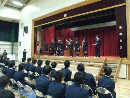 3年生の卒業練習も最後になりました。式の練習ののちに、同窓会(若竹会)会長様と本校PTAより、卒業記念品の贈呈がありました。同窓会について、ご挨拶とご説明をいただきました。それぞれの学級で委嘱された同窓会幹事としてよろしくお願いいたします。(副校長)