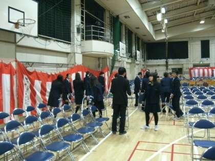 明日はいよいよ卒業式です。午後は式場の準備です。1年生も2年生も先生方も、明日が良い式になるようにと、心を込めて準備を進めました。準備の作業に祝福の気持ちがあふれていますね。(副校長)