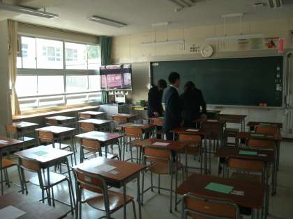 式場の準備が一段落した頃、職員室前では武井先生が3年生一人ひとりがつくったメッセージの掲示をつくっていました。周りに先生方もあつまり、3年間の思い出話に。また、3年生の教室は、生徒会がていねいに整備してくれました。いよいよ卒業式ですね。(副校長)