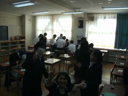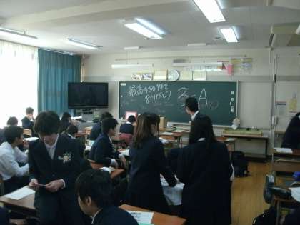 卒業生が登校してきました。いつもいよいよ卒業式です。最後の学活を前に、春の朝日が差し込む教室で思い思いに過ごしています。学年の暖かな雰囲気がゆったりとただよいっています。よい式になることでしょう。(副校長)
