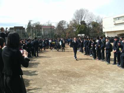 卒業式後は、保護者の方、在校生の見送りをうけて校庭から小泉公園まで行きました。担任の先生、友だちとの名残を惜しみました。(副校長)