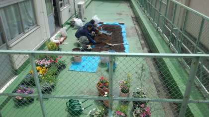 2階の視聴覚室のベランダに、きれいな春の花が整美されています。主事さんたちが心を込めて、生徒のみなさんのために環境を整えてくれているのです。桜も開花しましたが、まだまだ三寒四温といった感じですね。