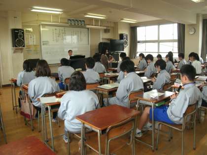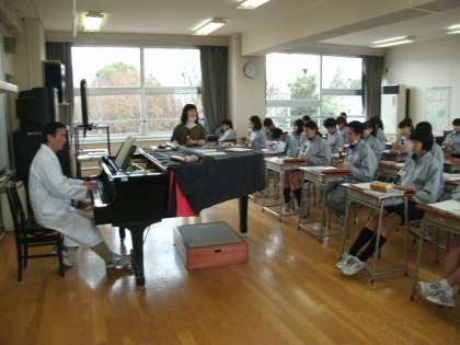 音楽の授業中です。これが2年生での最終授業です。1年間、2年生の授業の様子をカメラを通して見てきましたが、全体的に年間通じてよく取り組んでいましたね。今日は「早春賦」をみんなで合奏しています。3年生になってもがんばってください!!(副校長)