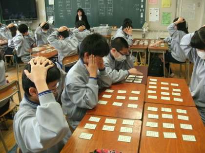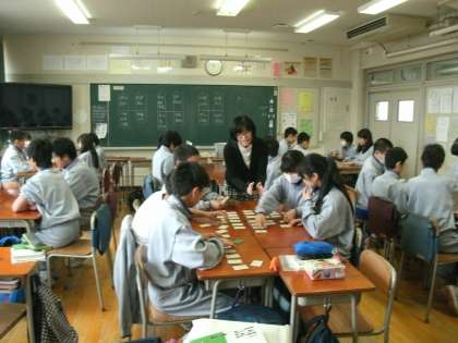 1年生の最終授業の様子です。国語の藤本先生のクラスでは、百人一首に取り組んでいます。1年生も話しをきちんと聞いて、班ごとへの移動などもスムーズです。みんなの成長した姿を感じさせます。(副校長)