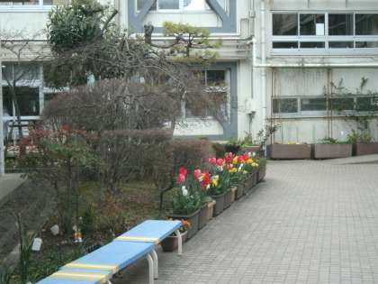 夕方に、校内を巡っていると、中庭のちゅーりっぷがすっかり開いていました。南向きのタンチ山の桜は、ようやく数輪が花をつけたところです。駒沢中のお花見は、まだしばらく楽しめそうですね。(副校長)
