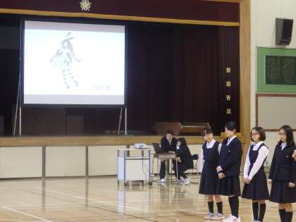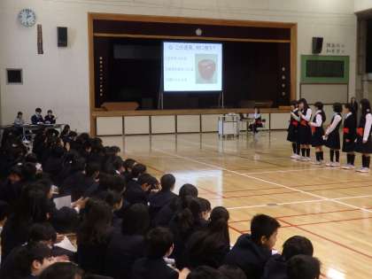 部活動オリエンテーション前半は吹奏楽部、卓球部、文芸映画研究部、JRC部、家庭科部、手話部、茶道部、美術部、サッカー部が発表しました。部活ごとに発表内容を工夫し、演奏や実技、スクリーンを使って活動の様子や作品を写す、クイズを出すなどとても充実した発表でした。引き続き後半の部も期待しています。(田村)