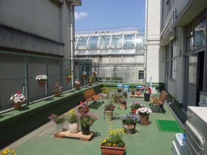 視聴覚室奥の屋外スペースに新たにできた花壇の様子です。とても整備が行き届き、いこいの空間になりました。