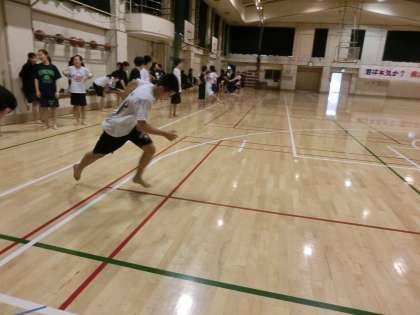 下半身の強化のために、裸足でのフットワークを取り入れています。男子は、明日、練習試合があります。「全部勝つ」つもりで準備しましょう。(遠藤)