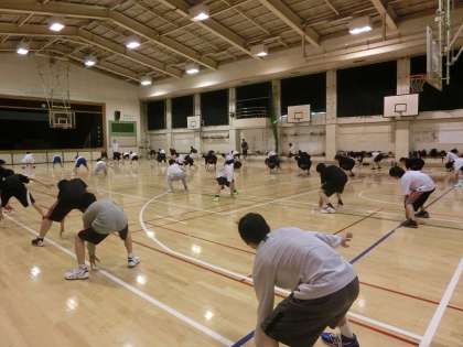 午後の体育館では、男女バスケットボール部が練習しています。男女合わせて60名の部員が、体育館でフットワークをしています。