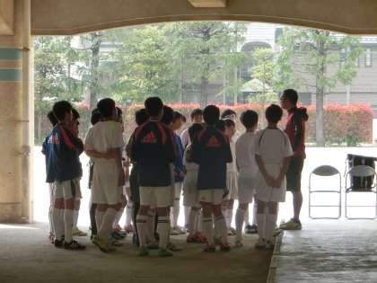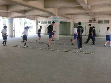 校庭では、サッカー部と陸上競技部が活動しています。サッカー部は練習前のミーティング中でした。陸上行儀部はラダートレーニングをしています。(遠藤)
