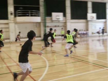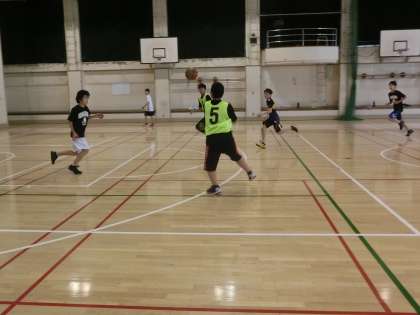 体育館では、男子バスケットボール部が活動しています。5対5でゲーム形式の練習です。ゲームの中で、練習してきたことを試して何ができて、何ができていないのかを確認しましょう。(遠藤)