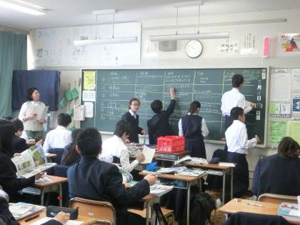 1年生の社会の様子です。熱帯や温帯、乾燥帯といった気候における植物や衣・食・住の特徴を調べ、調べたことを黒板にまとめていました。(遠藤)